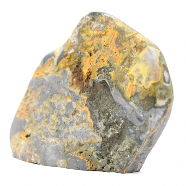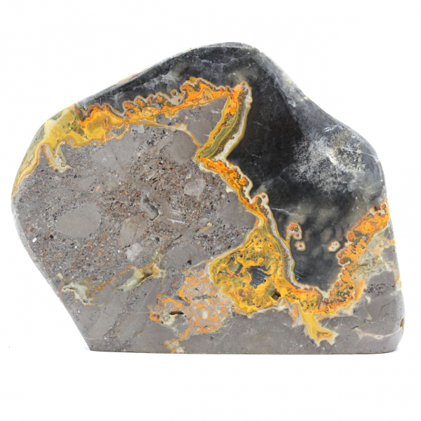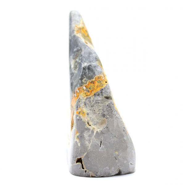 Le jaspe bumblebee, connu sous le nom de Jaspe bourdon, est un minéral issu des processus volcaniques. Cette pierre se distingue par sa composition minéralogique unique, intégrant principalement du soufre, des oxydes de manganèse et divers sulfures comme le réalgar et l'orpiment. Ses couleurs vont du jaune vif à l'orange, ponctué de bandes noires et grises