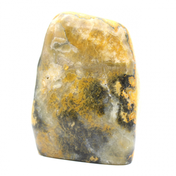 Le jaspe bumblebee, connu sous le nom de Jaspe bourdon, est un minéral issu des processus volcaniques. Cette pierre se distingue par sa composition minéralogique unique, intégrant principalement du soufre, des oxydes de manganèse et divers sulfures comme le réalgar et l'orpiment. Ses couleurs vont du jaune vif à l'orange, ponctué de bandes noires et grises